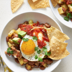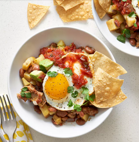 Layer the sausage, potato, and bean mixture over tortilla chips if desired and top with the eggs. Top with diced avocado, hot sauce or salsa, and scallions, if desired.