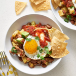 This recipe is flexible because it wants you to live your best breakfast life. So if you’re a person who lives by the tortilla, by all means, grab one and roll yourself a burrito. Nevertheless, there’s a sort of magic that happens when tortilla chips are tucked under the saucy potato-sausage mixture. They soften a bit and you’ll probably sigh with delight after each bite. Top the finished bowls with avocado, yogurt, or queso fresco as desired and keep the hot sauce close!