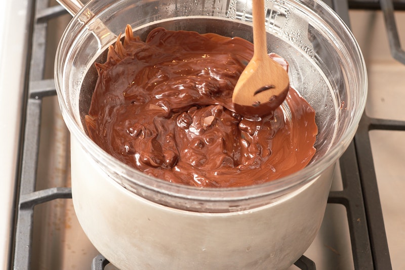 Melt the chocolates. Place the milk and dark chocolates in a medium heatproof metal or glass bowl. Bring a large skillet of water to a boil. Turn off the heat and set the bowl in the water. Leave the chocolate to melt gently while you prepare the dairy.
