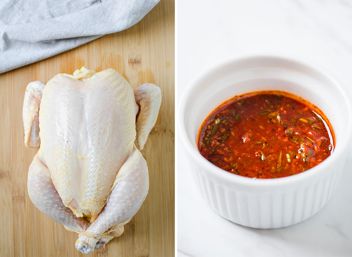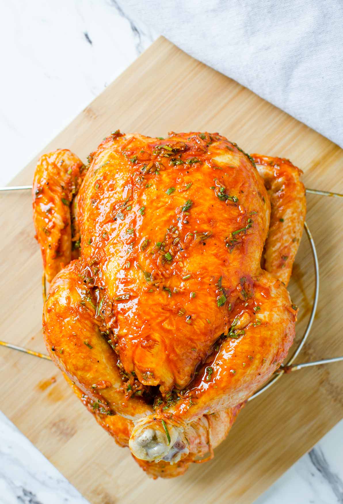 - Cooking time – it depends on the size of the chicken. Adjust the cooking time by ±5 min for every 1 lb change in the size of the chicken.
