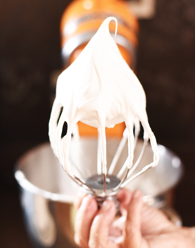 In KitchenAid’s Culinary Center’s bowl (once its clean and dry), pour the egg and sugar mixture and add the cream of tartar if you’re using it. Whisk on medium-high speed with the rods, until shiny, smooth and until the mixture remains on the rods without dripping (as pictured).