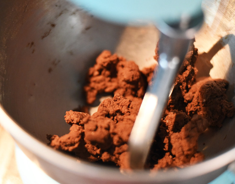 In KitchenAid’s Culinary Center bowl, mix the flour, cocoa, icing, salt and butter (should be cold). Mix at speed 4 until the texture is like sand (as seen on the photo) – no lumps of butter.