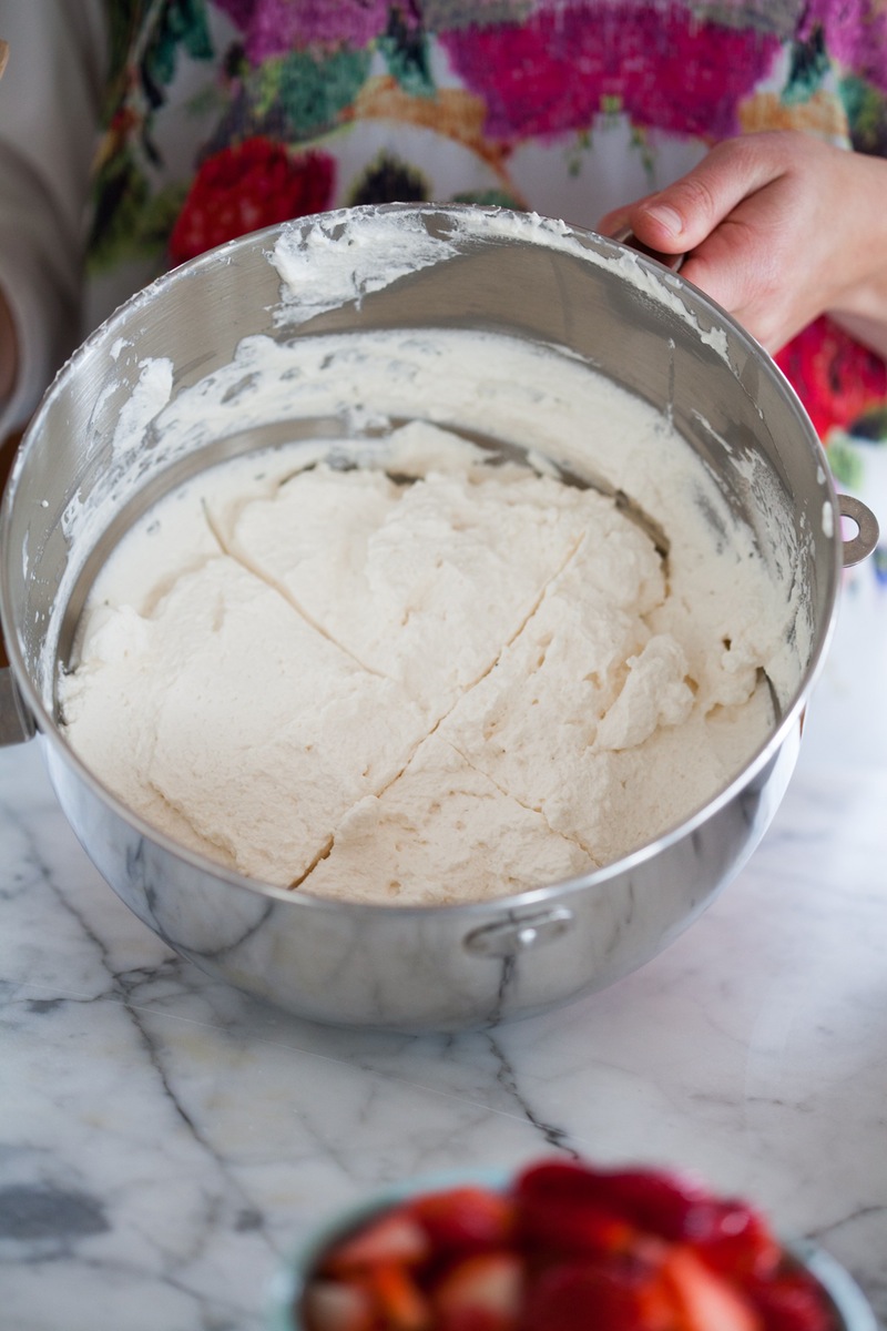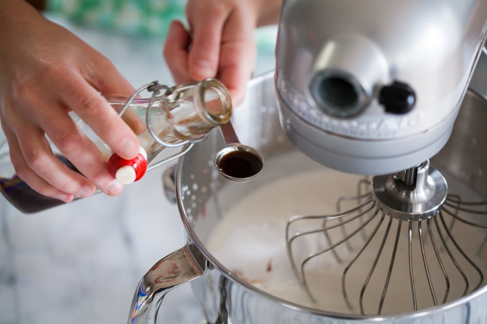 Beat the cream until it holds stiff peaks: Combine the powdered sugar, vanilla, and salt with the cream in the bowl of a stand mixer (or large mixing bowl). Beat on low, then high, until the cream holds stiff peaks. You can do this with a stand mixer, hand mixer, or whisk.