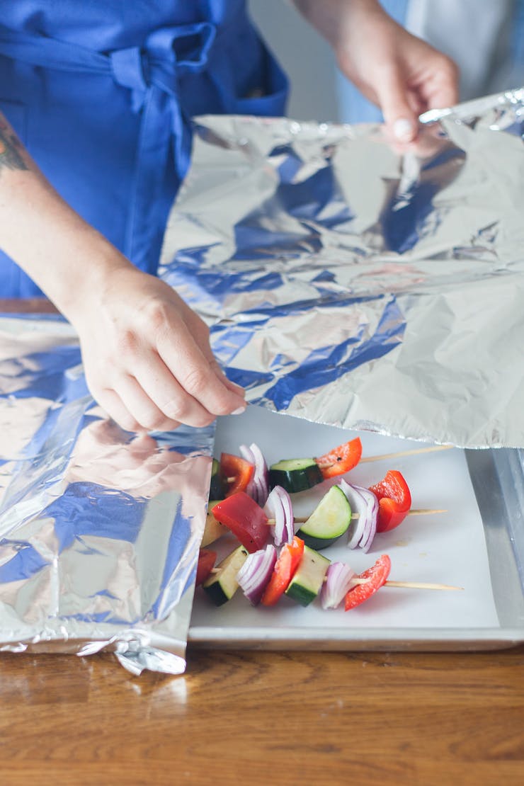 After they are flash-frozen, you can wrap the whole baking sheet in heavy-duty aluminum foil for long-term storage, or you can move the frozen skewers to a zip-top freezer bag. The freezer bag will save space in the freezer, but you may have to divide the kabobs into batches to accommodate the skewers and trim the ends if they’re too long.