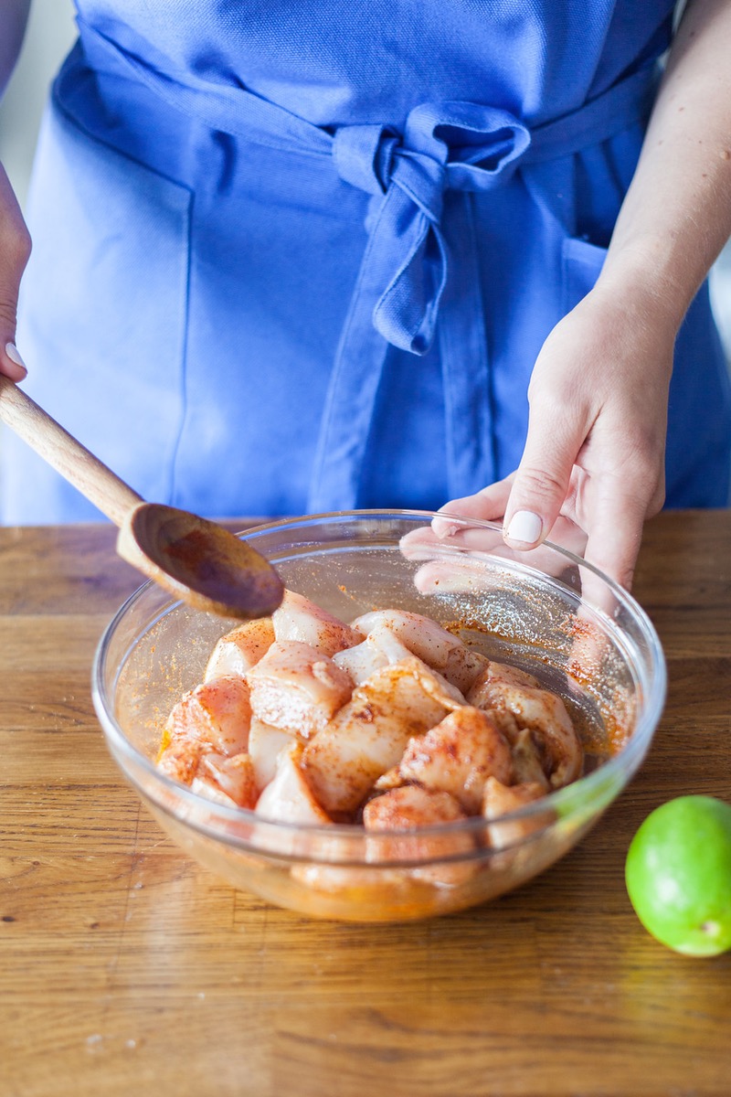 Marinate the meat: Combine the chicken, lime juice, 2 tablespoons of the oil, paprika, cumin, and chili powder a medium bowl and toss to thoroughly coat the chicken with the spices. Set this aside while you prepare the vegetables.