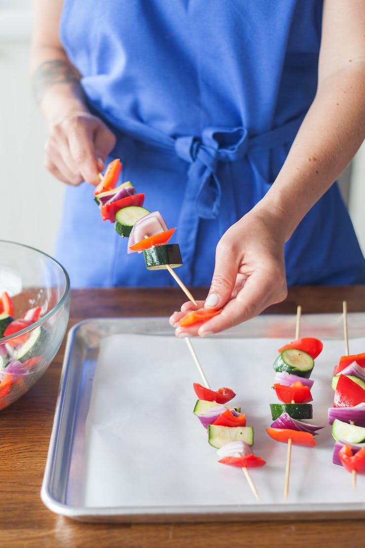 Make separate skewers of meat and vegetables: Skewering the chicken and vegetables separately also means that both the chicken and vegetables can cook for the appropriate amount of time.