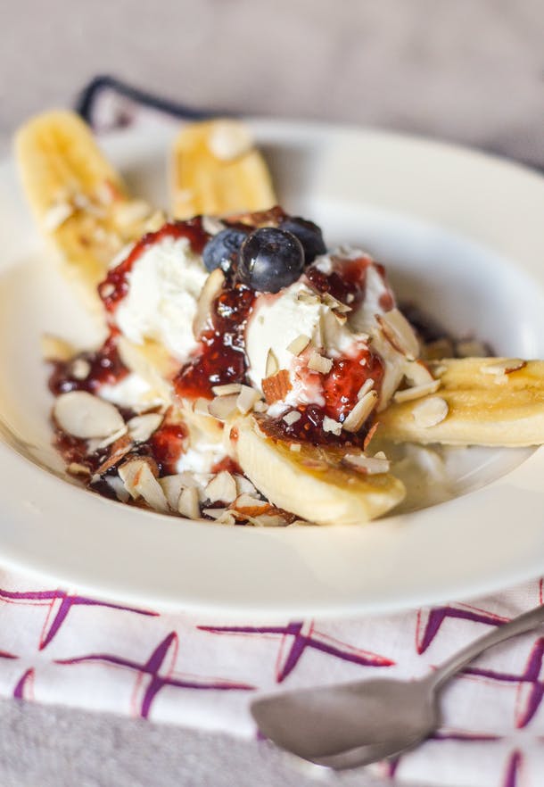 Mother’s Day breakfast doesn’t have to be fancy — especially if you have small kids who want to help prepare the meal. This easy “banana split” replaces ice cream with yogurt, and hot fudge with jam. You could even serve it as an appetizer in bed while the rest of the brunch meal is being prepared.