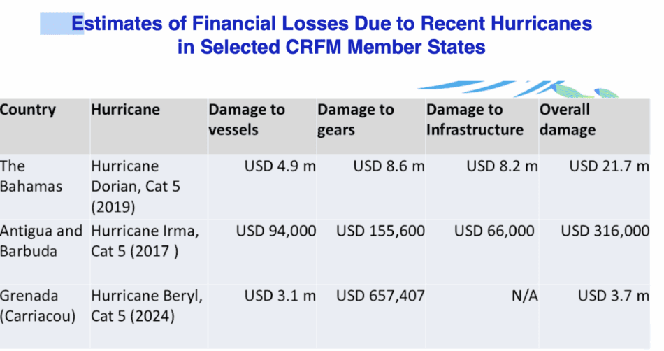 The risks are real! Mrs. June Masters, CRFM Statistics and Information Analyst, provided a snapshot (at the May 9 CARICOM Webinar) of the losses suffered by the fisheries sector in selected CRFM Member States as a result of recent hurricanes, including Hurricane Beryl in 2024.