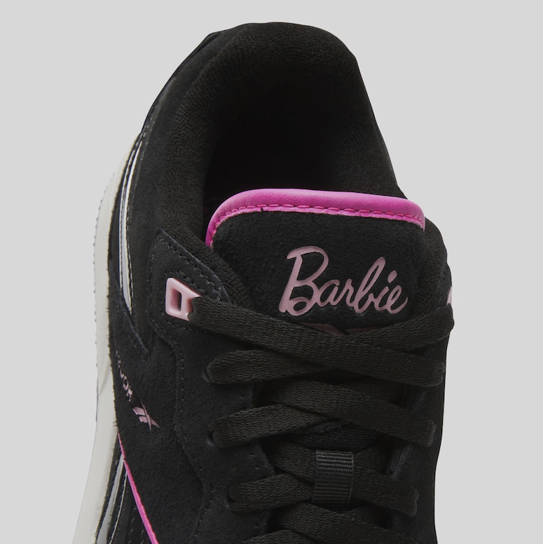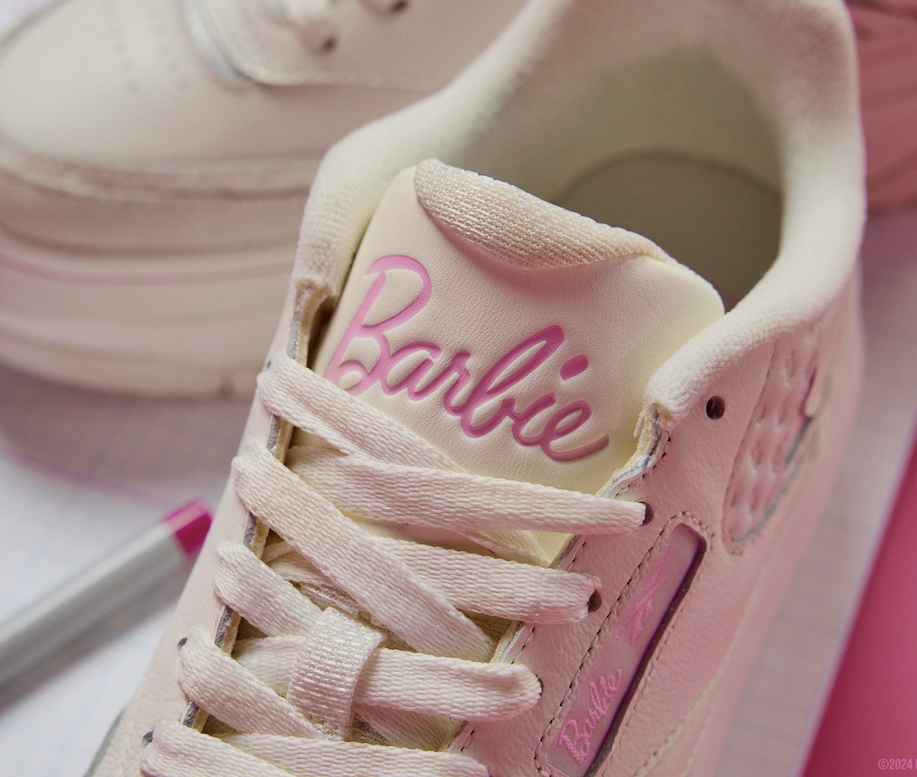 - Barbie x Reebok Club C Extra – Tonal deboss and semi-gloss Barbie ‘B’s’ subtly adorn leather panels of this platform Club C style paired with shine mesh detailing and light pink accents throughout. Available in both women’s s and kids/toddler sizes.