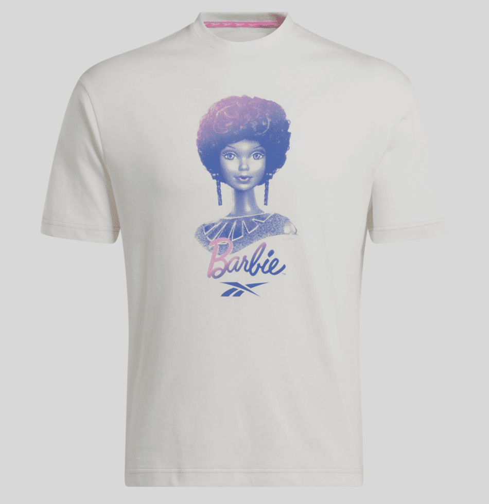 - The Barbie x Reebok Graphic Tee is one of the marquee pieces of the collection, paying homage to a milestone in Barbie’s history of diversity and inclusion. The graphic tee features an image of the first Black Barbie, released in 1980, designed by Kitty Black-Perkins, with an updated Reebok twist – subtle Reebok Vector logos on her signature earrings.