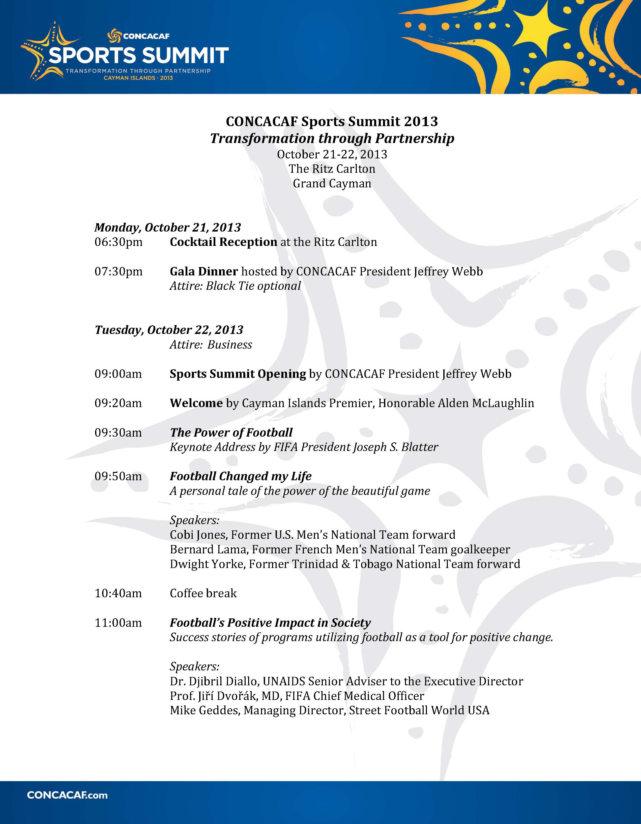 2013 Sports Summit “Transformation through Partnership,” to be hosted in the Cayman Islands at the Ritz Carlton (Seven Mile Beach, Grand Cayman), will take place on Tuesday, October 22.