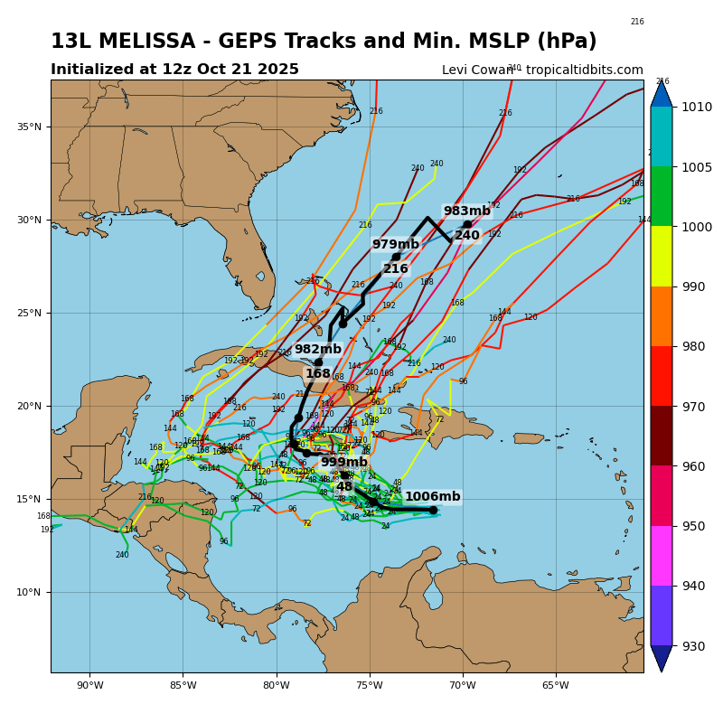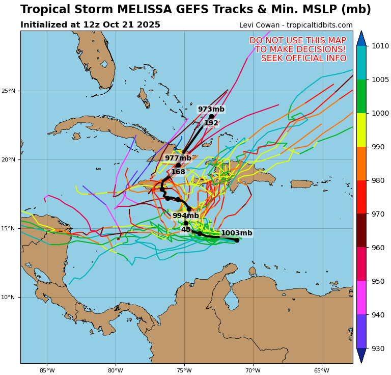 days, but it has slowed down significantly this morning, which has likely helped Melissa form. The initial motion is estimated to be 280/12 kt. Melissa should continue to slow down and gradually turn to the northwest and then north during the next couple of days toward a weakness in the subtropical ridge. This motion will likely take the storm very near the southwestern tip of Haiti and Jamaica by Thursday. After that time, the guidance diverges significantly with some models like the GFS and HWRF showing a motion to the northeast into the weakness, while the other solutions show a stall or a westward drift on the south side of a building ridge. An examination of the GFS, ECMWF, and Google DeepMind ensemble suites suggest that the majority of the members show Melissa not moving into the weakness and remaining in the Caribbean Sea throughout the week and into the weekend. The NHC official track forecast lies between the Google DeepMind ensemble mean track and the correct consensus aid, HCCA.