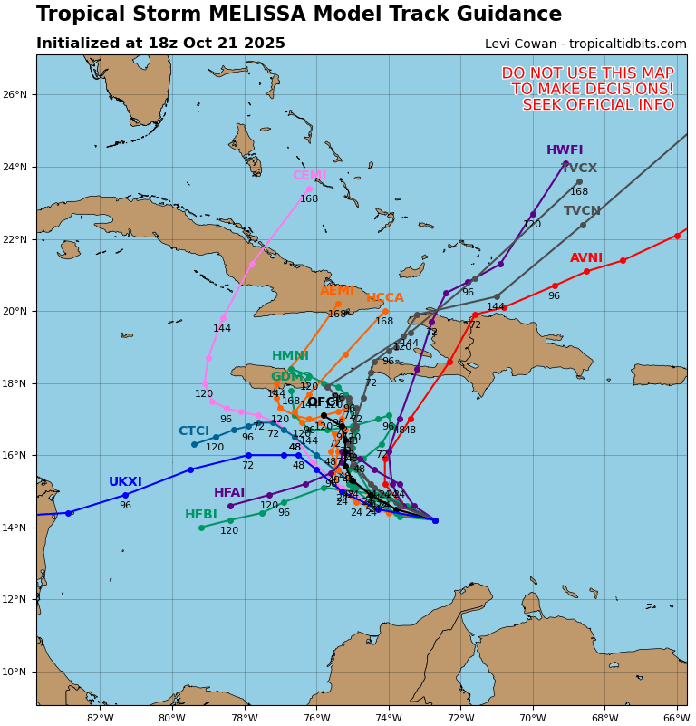 Caribbean, but the models suggest that vertical wind shear will be moderate with some dry air in the vicinity of the storm during the next few days. Based on these mixed signals, the strengthening trend is expected to be slow and steady, not rapid. However, the future intensity of Melissa is linked to the track and since that is quite uncertain beyond a couple of days, the strength of the storm is also quite uncertain. The NHC intensity forecast is in best agreement with the HCCA model.