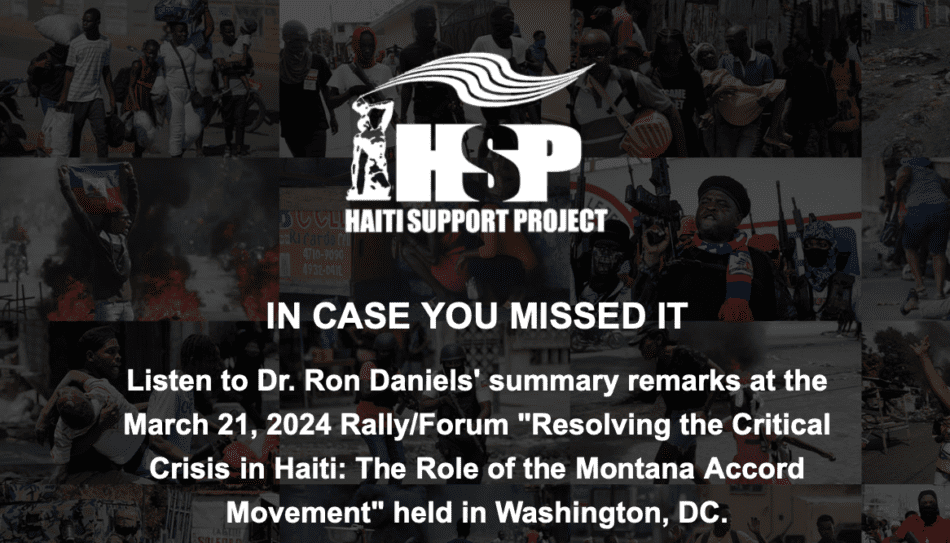 Founded in 1995 by Dr. Ron Daniels, the Haiti Support Project is an initiative of the Institute of the Black World 21st Century that is committed to “Building a Constituency for Haiti in the United States,” focusing on mobilizing/ organizing African Americans and other people of African descent to strengthen the process of democracy and development in the world’s first Black Republic. Learn more here — https://ibw21.org/hsp or contact us at — [email protected]