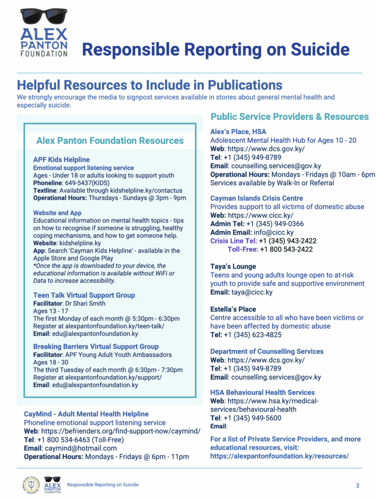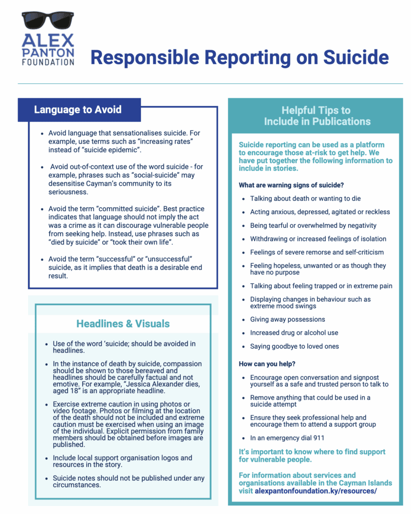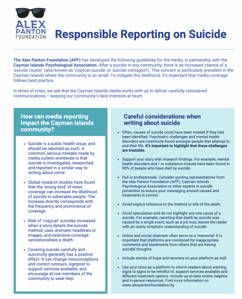 As the Marketing Chair of the Alex Panton Foundation, I am reaching out with deep concern following recent media coverage of the tragic passing of a former Miss Jamaica contestant earlier today. We recognise the importance of reporting on such significant news; however, we respectfully urge your newsroom to exercise caution in how suspected suicides are covered.
