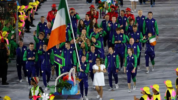 Flag bearer Patrick Barnes of Ireland leads his team during the Opening Ceremony of the Rio 2016 Olympic Games at Maracana Stadium on August 5, 2016 in Rio de Janeiro, Brazil. Photo: Getty