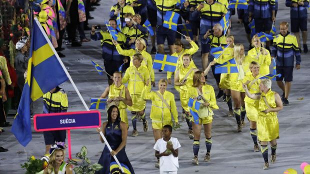 Therese Alshammar carries the flag of Sweden during the opening ceremony for the 2016 Summer Olympics in Rio de Janeiro, Brazil, Friday, Aug. 5, 2016. Photo: AP