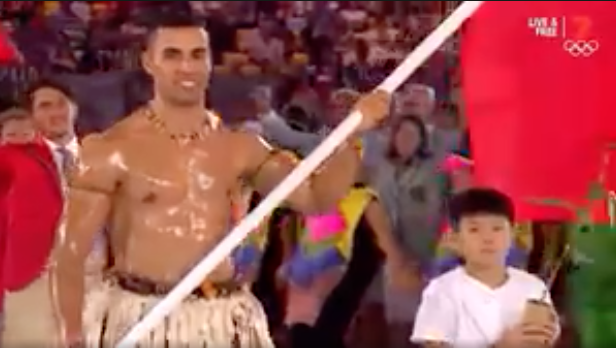 Tonga’s Australian-born flagbearer Pita Nikolas Aufatofua has proven that less is more. Courtesy of the Seven Network