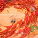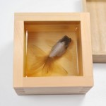 First: watch the video. Japanese artist Riusuke Fukahori paints three-dimensional goldfish using a complex process of poured resin. The fish are painted meticulously, layer by layer, the sandwiched slices revealing slightly more about each creature, similar to the function of a 3D printer. I really enjoy the rich depth of the pieces and the optical illusion aspect, it’s such an odd process that results in something that’s both a painting and sculptural. Wonderful.