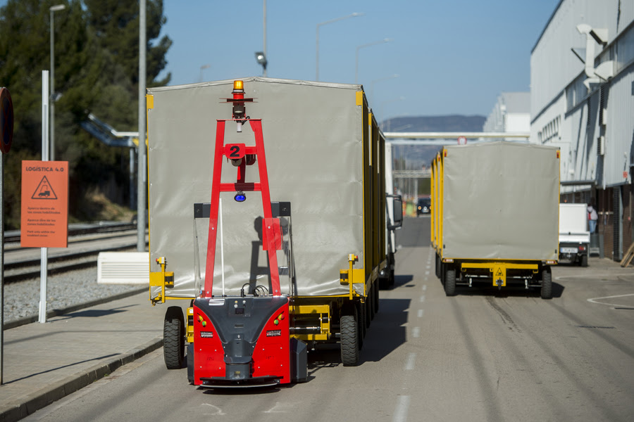 No guidance systems or cables. A total of eight robots are on the road at the SEAT Martorell factory. Each convoy can carry 10 tonnes and together they transport up to 2,000 parts per day. All without magnetic guidance or cables. How do they work? The AGV are programmed to read their surroundings. In order to know which route to follow, first they are guided, and by means of an integrated camera, they memorise it. Then all they have to do is repeat it: they leave the base, see a two-storey building on their left, then an intersection, there they turn right… one reference point after another until they reach their destination. “If at any time it loses that reference, because something crosses its path that blocks the map it has memorised, the robot will stop until the reference point becomes visible again”, explains Victor Palacios, a logistics engineer at SEAT and the head of the project.