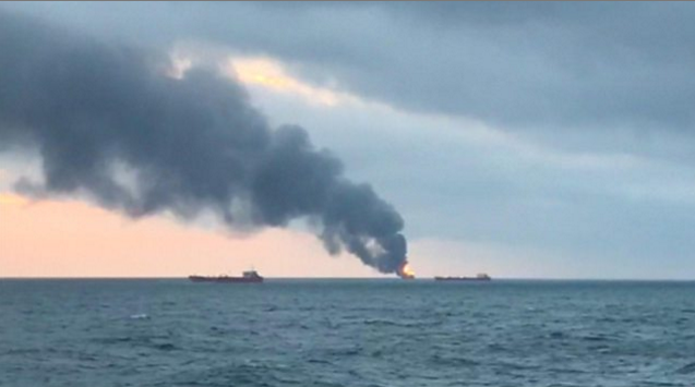 At least 10 people have died in a fire involving two Tanzanian-flagged cargo vessels in the Black Sea near the Kerch Strait, authorities say.