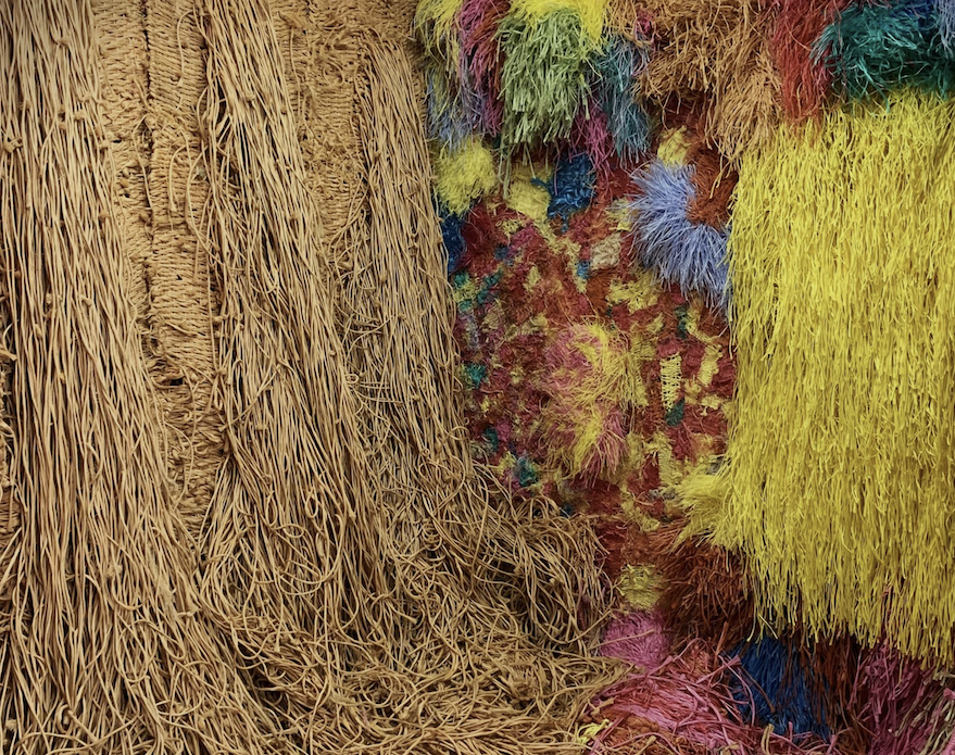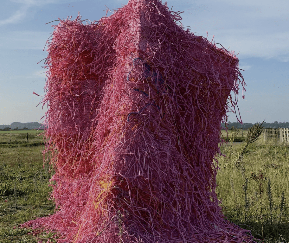 Titled Three Coverings, Fleming’s larger-than-life, abstract sculptures occupya garden evocative of the British countryside. The brightly-coloured woven works are made from discarded baling twine, donated by farmers living locally to Fleming in Oxfordshire and Berkshire. To create her sculptural forms, she embarks on a repetitive “building” practice – a self-developed weaving process which involves stretching and unravelling the twine to produce masses of material. Fleming says her practice represents “a need tocontinually make, to fill time.” The result is a visually and sensorially arresting experience.