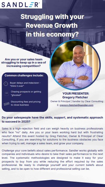 The Cayman Islands Chamber of Commerce is pleased to announce its upcoming Lunch & Learn session, featuring Gregory Fletcher, Owner & Principal of Clear Consulting Group Ltd, the exclusive provider of Sandler Training in the Cayman Islands.
