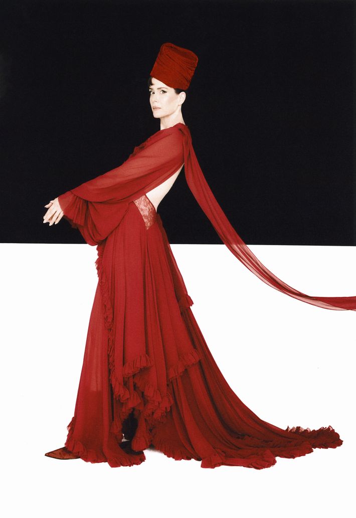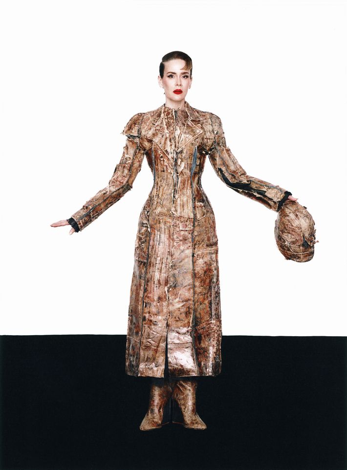 All’s Fair is one of Paulson’s few straightforwardly glamorous roles. With Kardashian’s involvement, the show took on a high-fashion bent, which gave Murphy and Paulson a distinct layer to apply to the character: Lane is all glamour on the outside (her character’s look took inspiration from Steven Meisel’s photographs of Linda Evangelista and Christy Turlington), but the chic sheen masks the character’s pain, both psychological and physical. Case in point: Murphy says he wanted to integrate gloves into Lane’s wardrobe. Paulson took that detail and blew it out, creating a backstory about how the character used to cut herself and needs gloves to hide the scars. “What happens is that she’ll tell me something like that and I go off and write it and rarely does she have a question because she likes the challenge of, Okay, it’s my job to interpret it,” says Murphy.
