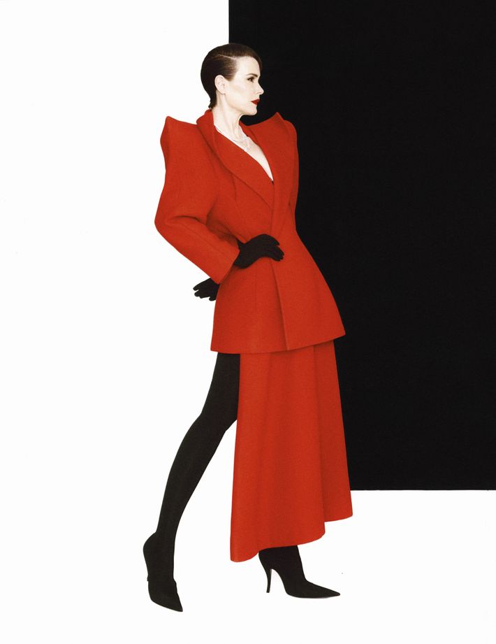 BALENCIAGA HAUTE COUTURE Open-Neck Jacket and Apron Skirt in Bright Red Wool, Wrist Gloves in Black Technical Jersey, and Concerto Pumps Pantashoes in Black Spandex Jersey, at couture.balenciaga.comBVLGARI High Jewelry Serpenti Necklace, at bulgari.com. Photo: MAR+VIN