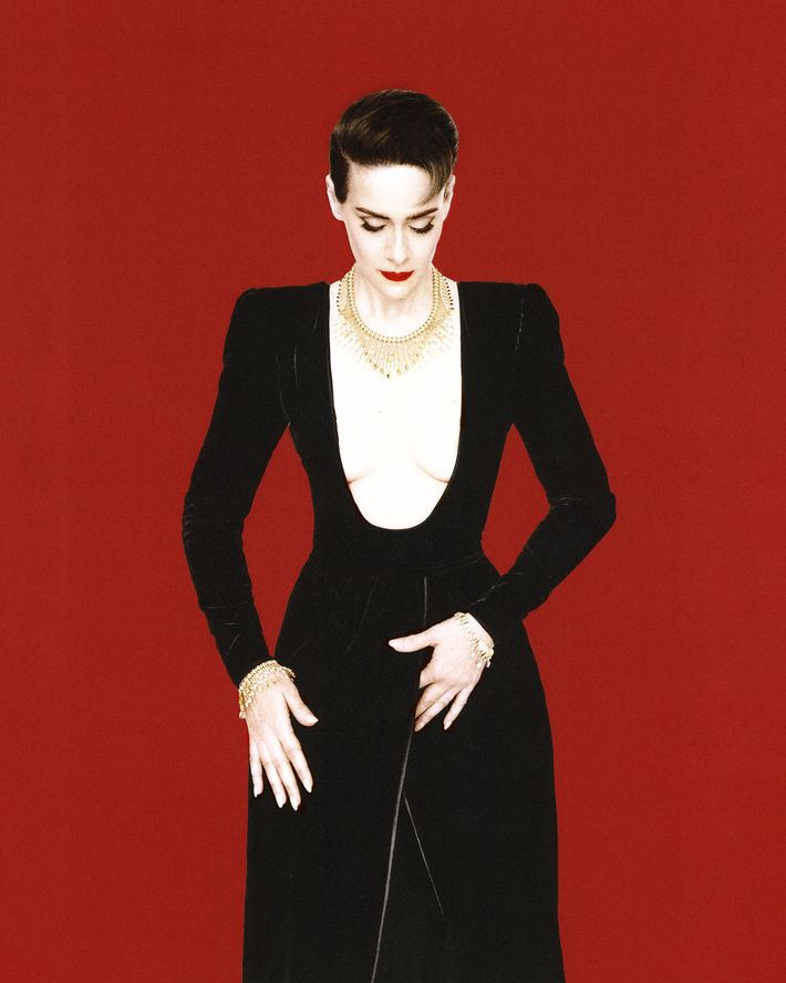 To describe Paulson is to pull out all the offbeat adjectives from the back of the drawer: She’s zany and ribald and outré, telling me about her Bart Simpson–esque burps and debating what we should call boobs (“I’m certainly not saying ‘breasts.’ I know someone who says ‘bosom,’ and that’s not my favorite thing, and she knows I don’t like to hear the word. And maybe that person is Holland Taylor”). When the ticket scanner makes a Martian-sounding zap as we enter the museum, she makes a zap sound right back. She had been eager to see the John Singer Sargent exhibition, in part because Taylor, an actress and Paulson’s partner of ten years, has told Paulson that she reminds her of Sargent’s best-known work, Madame X. A painting of an elegant 19th-century socialite in a black gown that contrasts starkly with her pearlescent skin, the portrait was considered shocking for the time. “It was something I wore or something, and she said, ‘Sometimes you look like a Sargent painting,’” Paulson recalls.