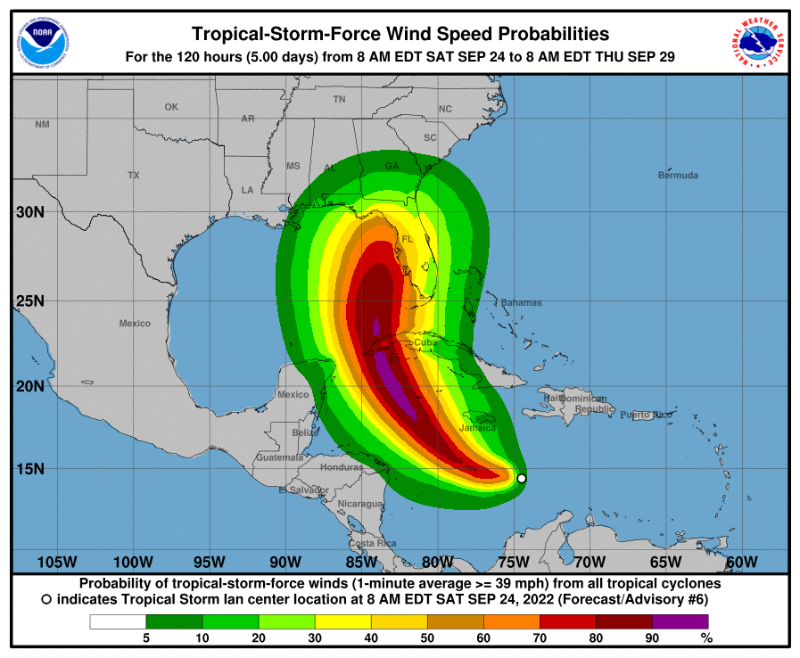 At 10am, the centre of Tropical Storm Ian was located near latitude 14.4 °north and longitude 75.2° west which places TS Ian about 520 miles south east of Grand Cayman. The system is moving west towards the west at near 15 miles per hour, with maximum sustained winds near 45 miles per hour, with higher gusts. The closest point of approach places the centre at 68 miles south west of Grand Cayman around 6am.