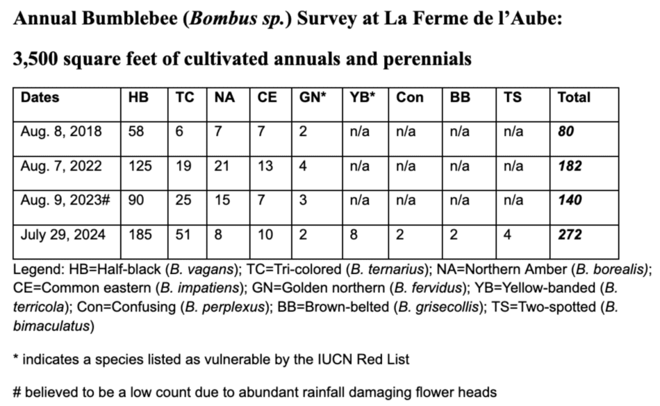 In 2024, the count was beyond expectations, up 340 percent. The number of species observed increased from five to nine, and one, the Yellow-banded bumblebee Bombus terricola, is listed as vulnerable by the IUCN Red List and of special concern in Québec. Finding this species helps to prove that veganic growing practices are working to potentially eliminate bumblebee declines in the region.