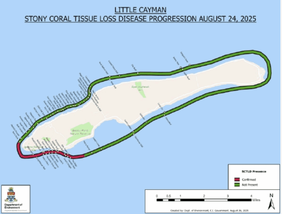SCTLD is an aggressive disease in which coral tissue dies within days, weeks or months, depending on species, exposing the bare calcium carbonate skeleton. Up until recently there have been no confirmed reports of SCTLD in the Sister Islands. SCTLD data from Grand Caymans has shown that the disease travels approximately at a rate of one mile per month. The survey in Little Cayman therefore suggests the infection likely became established in July 2025.