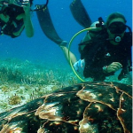 Since 2000 the Cayman Islands Department of Environment (DOE) has been capturing, tagging, and releasing turtles in Cayman waters to determine population size, migration patterns, growth rates, habitat use and diving behavior. Data collected with time depth recorders and acoustic tags shows that hawksbill and green turtles dive deeply on the Cayman wall, sometimes as deep as 300 ft. By using the turtles’ DNA as a kind of genetic bar-code, DOE has also discovered that young hawksbill turtles in Cayman hatched on beaches in Central America, Mexico, and the Eastern Caribbean. This means young turtles have travelled hundreds or thousands of miles by the time they reach Cayman, critical information in protecting the migrating sea turtles.