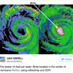 A radar grab from the Severe Weather Institute’s Radar and Lighting Laboratories in Alabama showed birds trapped in the eye of Arthur near Newport and Morehead, North Carolina.