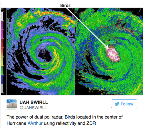 The power of dual pol radar. Birds located in the center of Hurricane #Arthur using reflectivity and ZDR