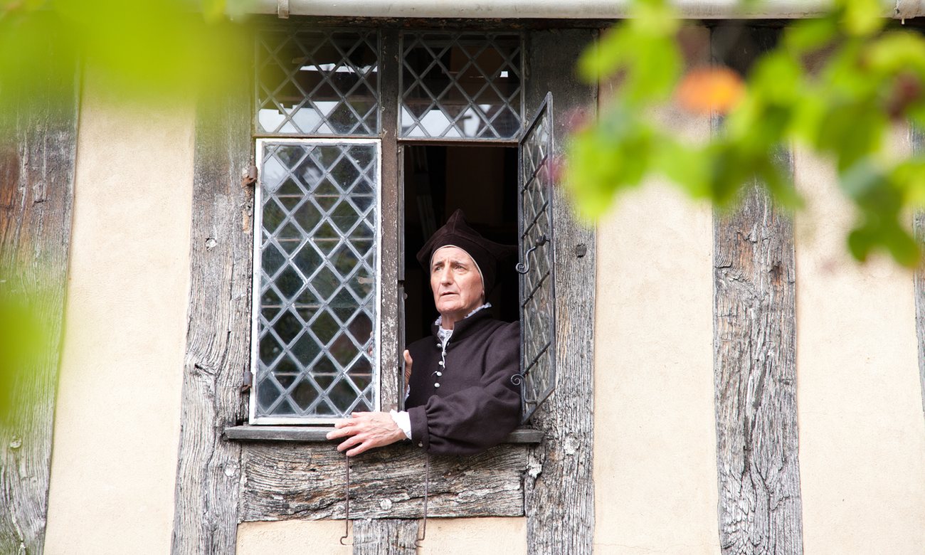 An actor in period dress at an upper floor window at Shakespeare’s Schoolroom, Stratford-upon-Avon, UK