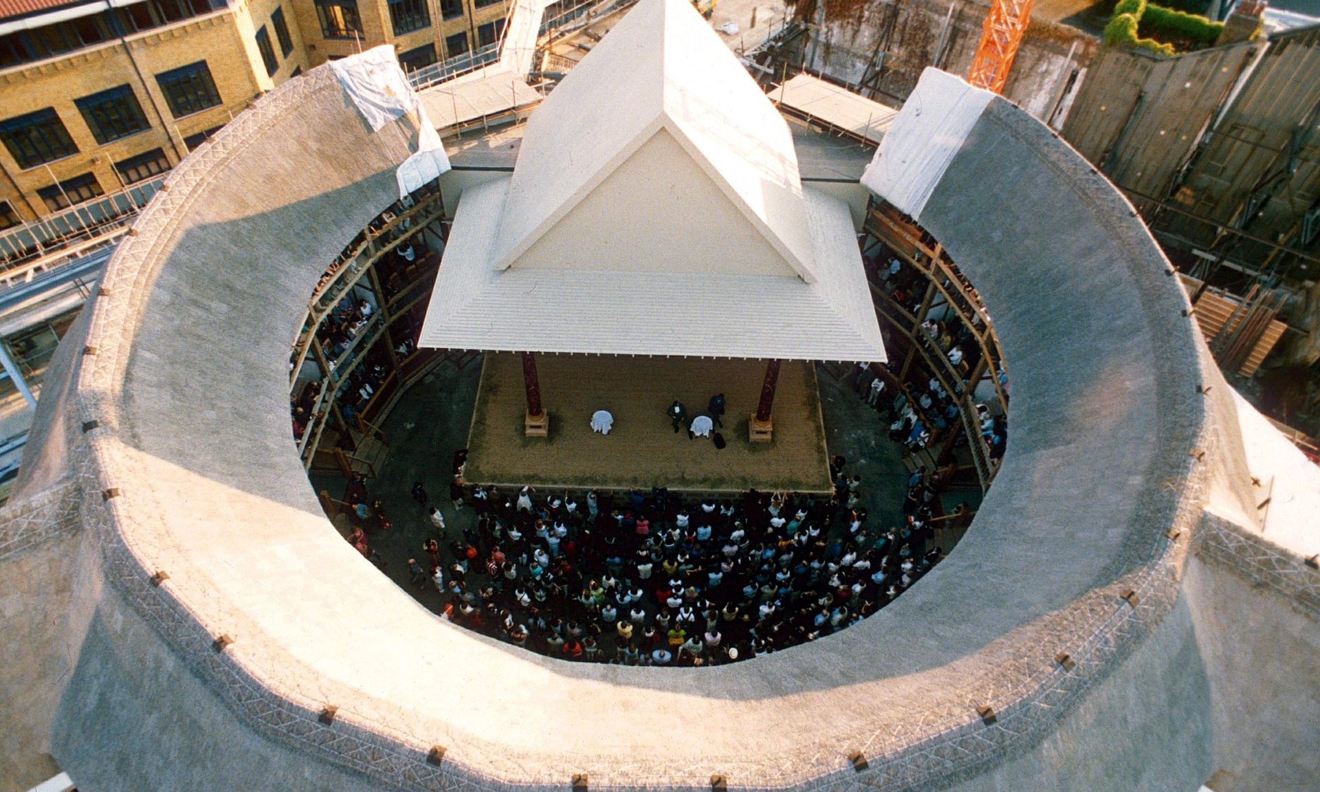 Shakespeare’s Globe theatre, London, in an aerial shot taken during a daytime performance. Globe trotting … Shakespeare’s Globe theatre will be the focal point of a Bard-related stroll by the side of the Thames. Photograph: Anthony Upton/Rex