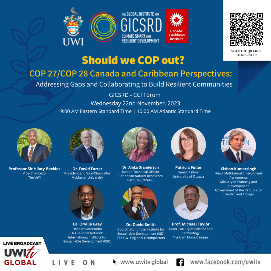 The University of the West Indies (The UWI) Global Institute for Climate-Smart and Resilient Development (GICSRD) in collaboration with the Canada-Caribbean Institute cordially invite you to a Virtual Discussion entitled Should we COP out? COP 27/COP 28 Canada and Caribbean Perspectives: Addressing Gaps and Collaborating to Build Resilient Communities, on Wednesday, November 22, 2023.