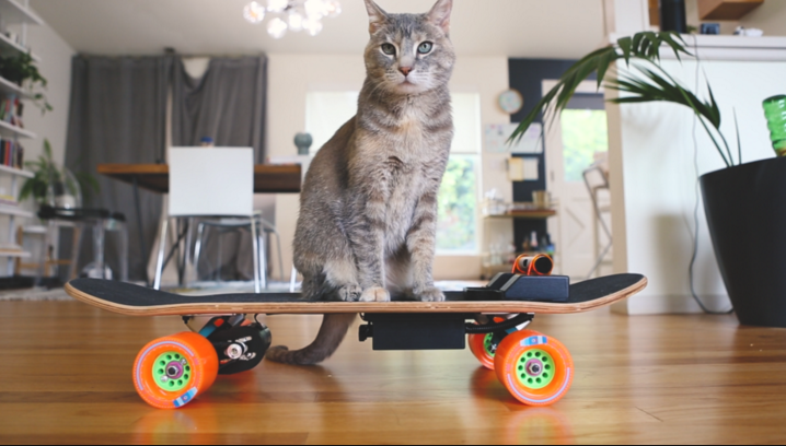 I built an electric skateboard for my cat to ride. Put a treat into the throttle lever, and she pulls it to get a snack and a boost!