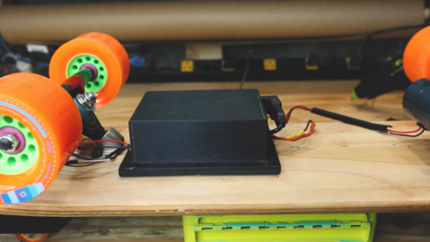 The board was prototyped and built using a Glowforge for custom housings, scavenged parts from electronics, some off the shelf electric skateboard drivetrain components, and a Adafruit Feather microcontroller.