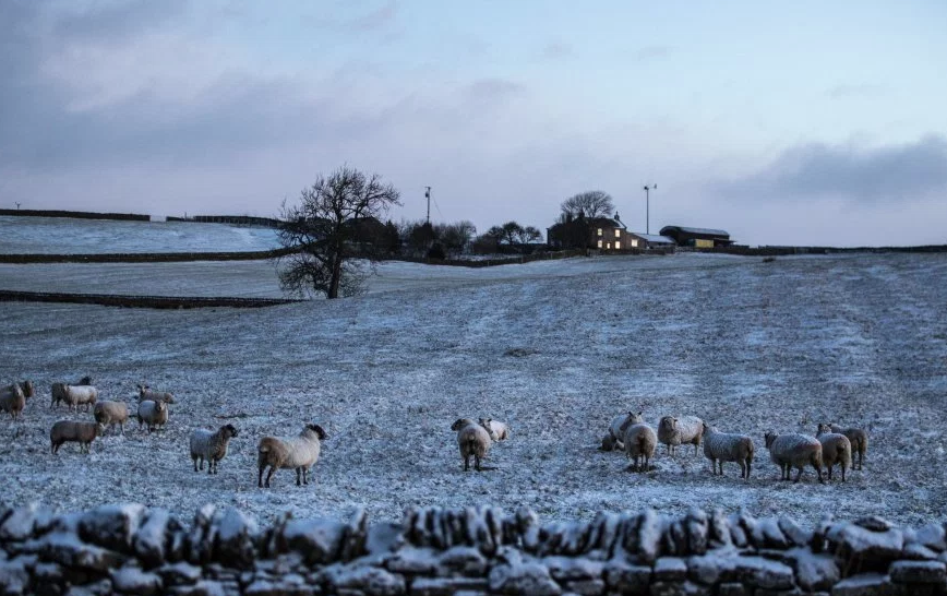 Sheep stand in a field blanketed by overnight snow at Eggleston, near Barnard Castle, as dawn breaks in the North Pennines (Picture: PA)