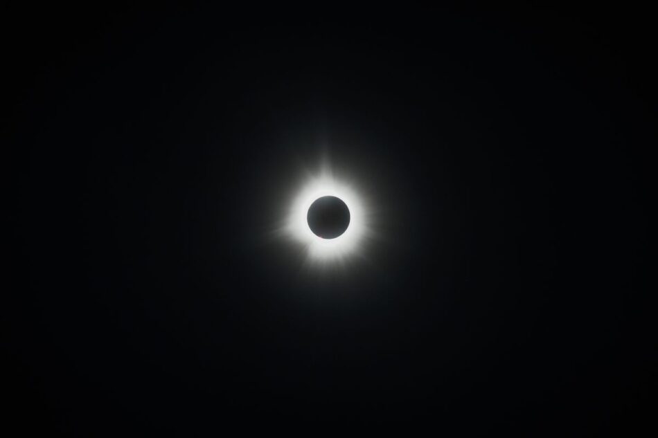 The sun’s corona shines in the dark sky during totality over Glover, Vermont.