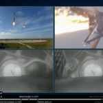 The two bottom screens in this shot from the video stream show the boosters heading toward each landing site.