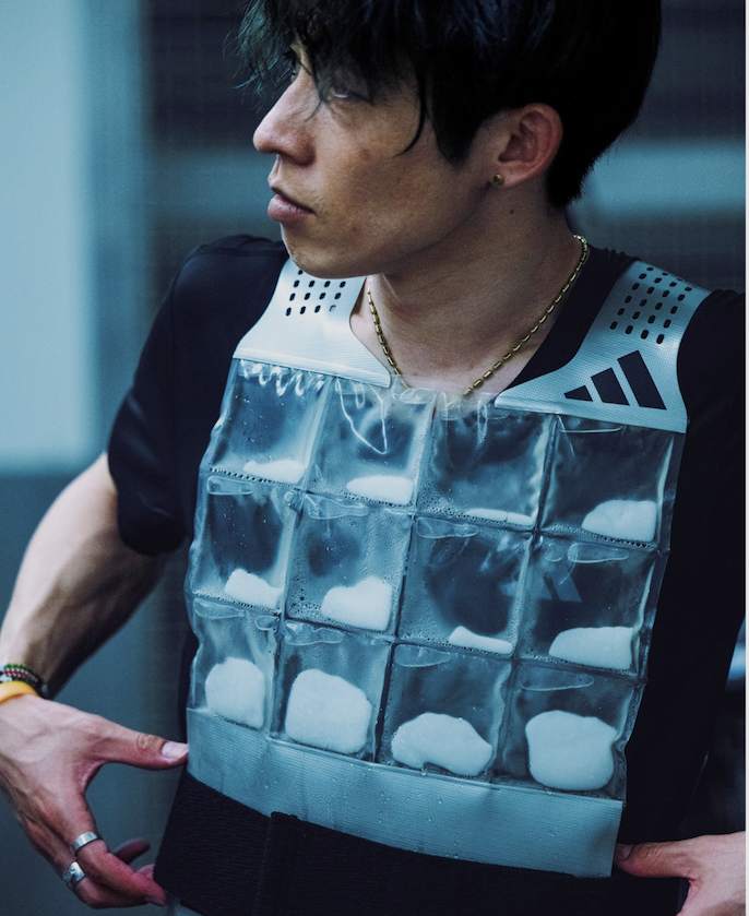 - CLIMACOOL Pre-Cooling & Per-Cooling System – Before the race, athletes used a combination of cooling and insulating technology to enhance thermal regulation. Combining a cooling vest and a CLIMACOOL insulating fan jacket – as worn by the AMG Formula 1 team – this minimized athletes’ core temperature and heart rate in the first hour of performance, supporting overall endurance. During the race, each athlete had their own set of cooling necks, swapped out and refreshed. Created by adidas specifically for this attempt, the cooling neck is ergonomically moulded to the main arteries and veins for maximum cooling.