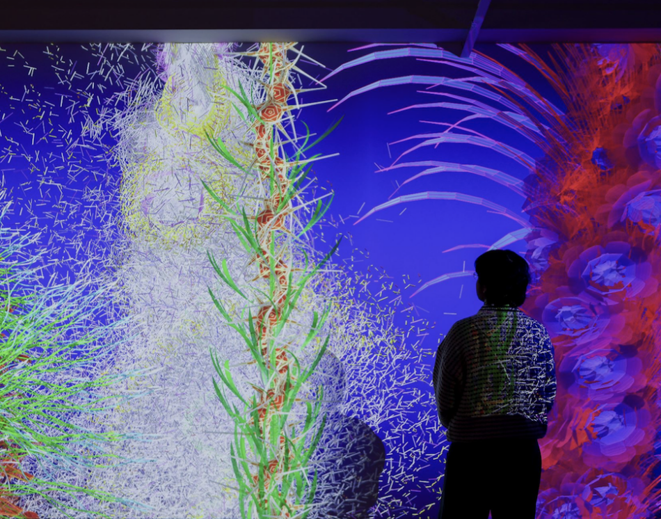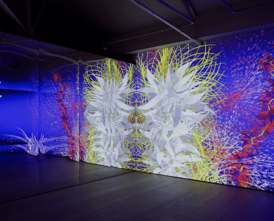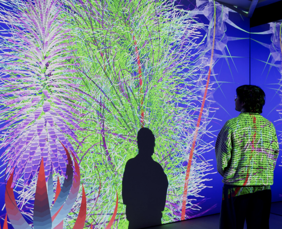 Room 7: MIGUEL CHEVALIER, EXTRA-NATURAL is a generative and interactive virtual reality installation, bringing virtual flowers and plants to life across 70 square metres while interacting with visitors’ movements. Extra-Natural presents a lush, virtual garden that blends dream and reality, filled with imaginary plants—luminescent, fluid, and vibrant. Using algorithms, Chevalier creates a dynamic environment where plants grow, bloom, and fade in endless cycles. The garden constantly evolves, with plants responding to movements through infrared sensors, undulating and shifting in a graceful, poetic dance. This interactive installation invites reflection on the fragility of nature and the urgent need to preserve biodiversity, creating a new symbiosis between humans and the environment.