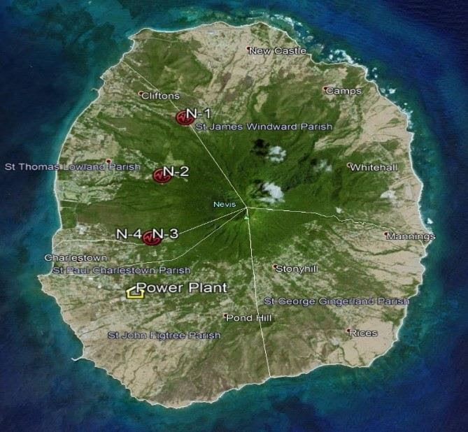 Map of Nevis: Production drilling is set to take place at the geothermal field containing wells N-3 and N-4