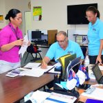 ESO Statistical Officer Ivan McLean tabulates the impromptu survey results. L-r: ESO Accounts Officer Joyce Christian, Statistical Officers McLean and Narnia Ebanks.