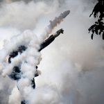 A demonstrator throws back a tear gas grenade while clashing with riot police during the so-called “mother of all marches” against Venezuela’s President Nicolas Maduro in Caracas, Venezuela, on April 19, 2017.