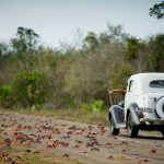 A man driving a vintage car reacts as he passes by crabs crossing a highway on their way to spawn in the sea in Playa Giron, Cuba, on April 21, 2017.